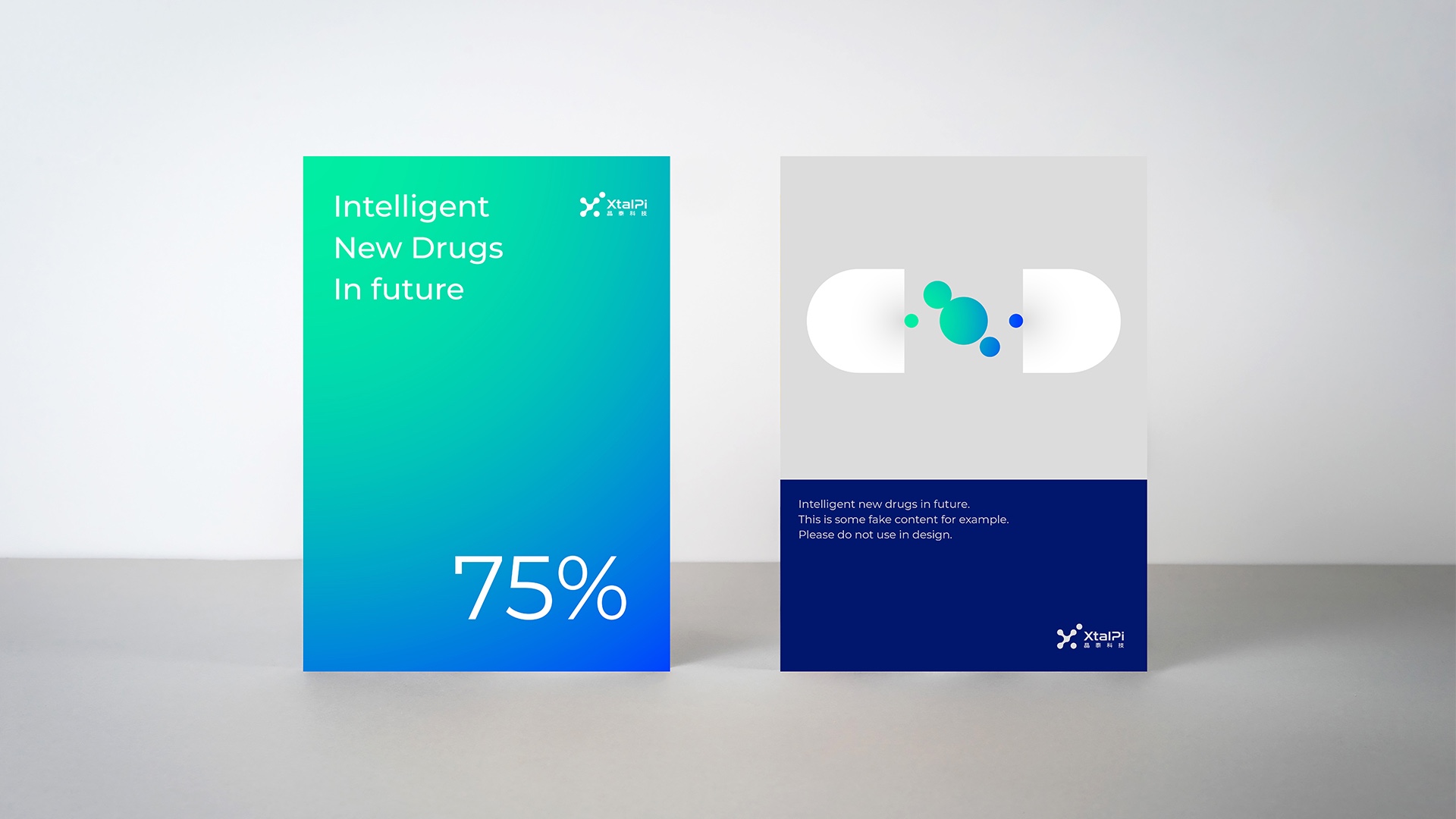 在量子計算相關的視覺設計中,煥識延續晶泰科技原有品牌資產,基于Pi(π)所代表的技術探索精神,構建嚴謹的網格系統,將分子基礎圖形元素與流動的線條結合,既體現量子技術的精準與有序,又彰顯AI技術的靈動與智能,這一設計思路與量子計算logo設計的核心需求高度契合,讓抽象的量子技術變得可觸可感。在色彩搭配上,煥識保留品牌原有色相,提升色彩飽和度與亮度,將洋溢著生機和活力的綠賦予藥物發現,將嚴謹科學的藍賦予化學服務,藍色與綠色通過漸變的方式融合,既增強了視覺沖擊力,也反應出品牌面對未來創新的情緒,完美契合量子科技VI設計的行業特質。
